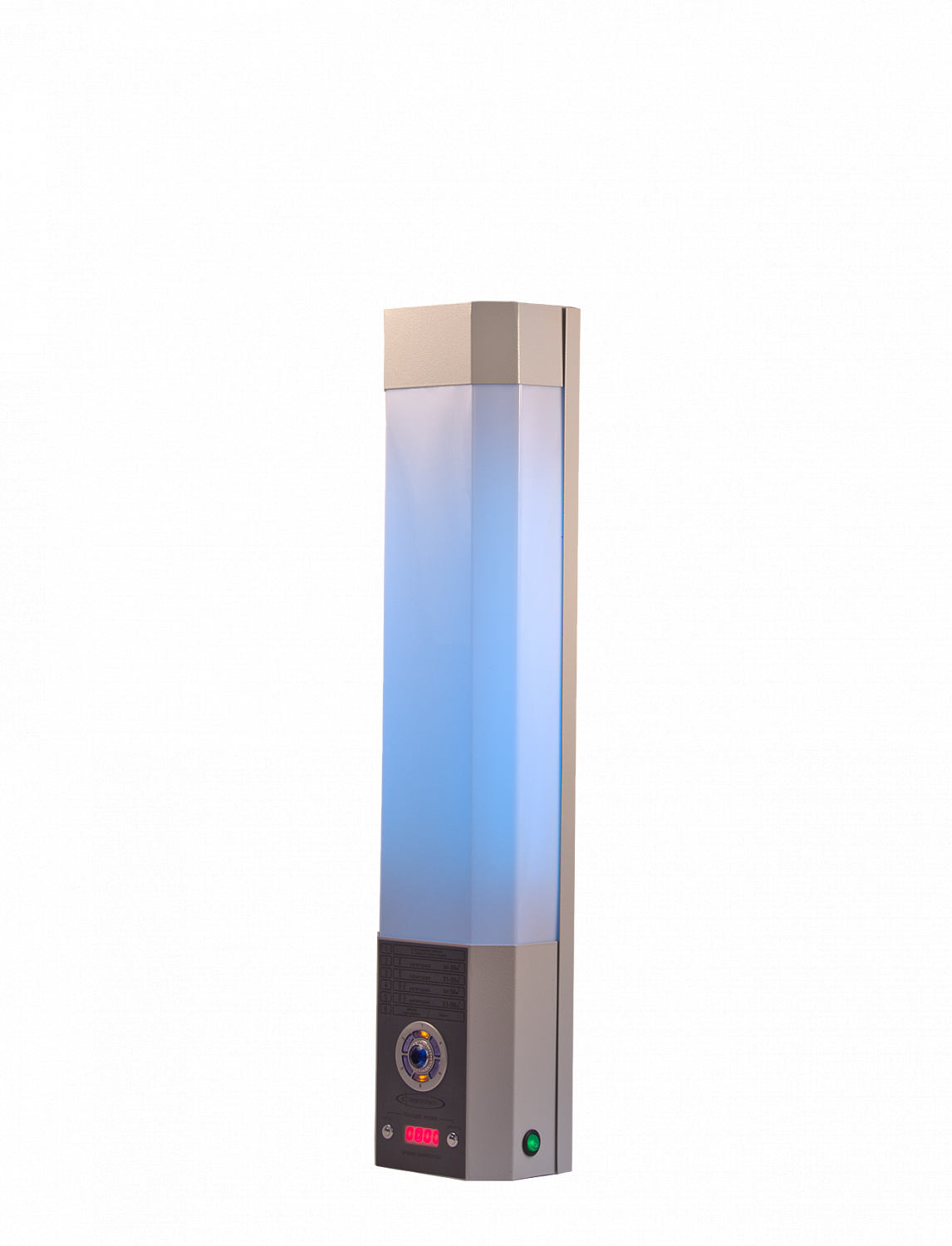 · Control - control panel of irradiation modes according to the selected type and volume of the room. Electronic control unit keeps track of the total operating time of lamps and has the ability to automatic mode settings according to the type/volume of the room. LCD display, displays information about the technical condition of the recirculator units.